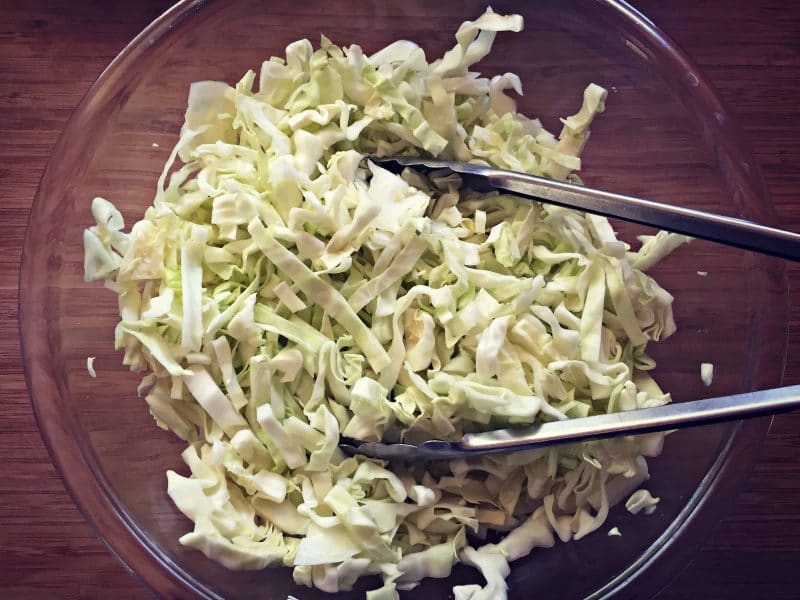 - Shred the cabbage. Place into a large bowl, sprinkle with salt, then toss with salad tongs.