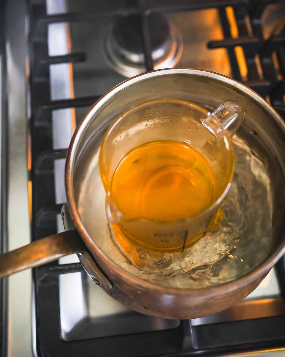 If you don’t own a double boiler, it’s easy to create a makeshift one by putting a small bowl or glass Pyrex measuring cup over a pot with about an inch of simmering water.