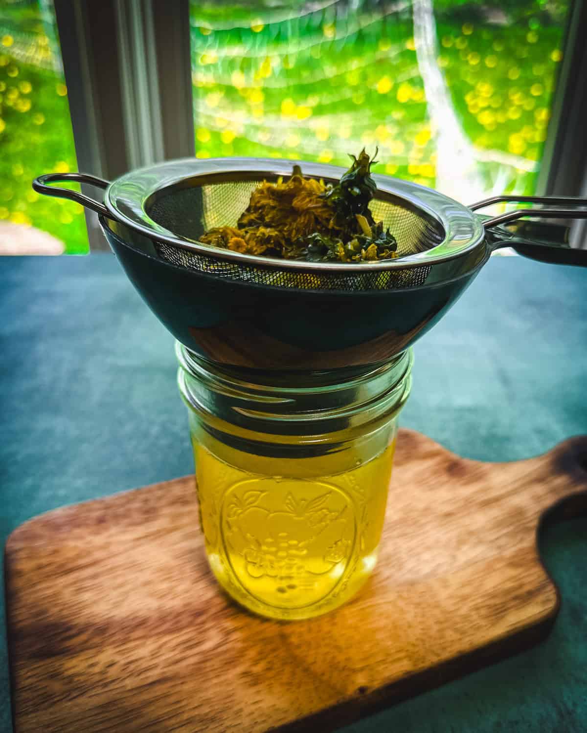 Once it’s cooled, strain out the dandelion flowers from the tea.