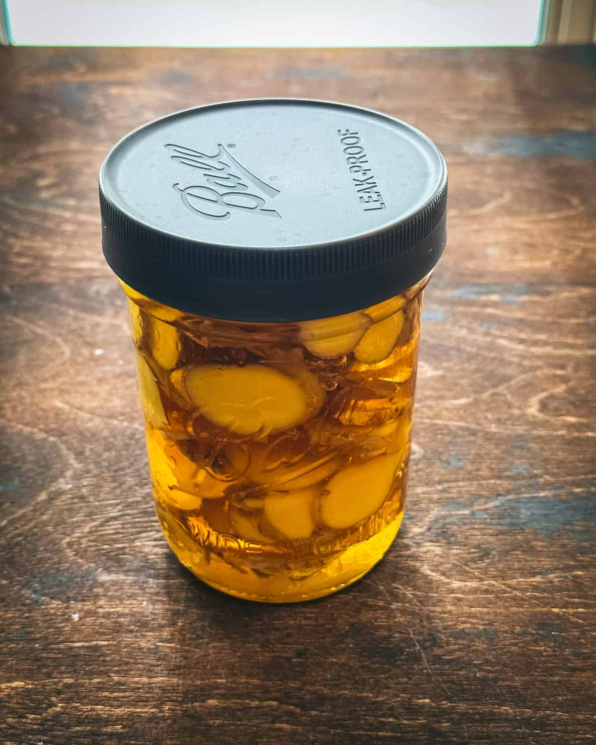 - Every day or so, tighten the lid on the jar and flip it upside down to coat the ginger slices with honey. Loosen the lid again when you return it to the upright position.