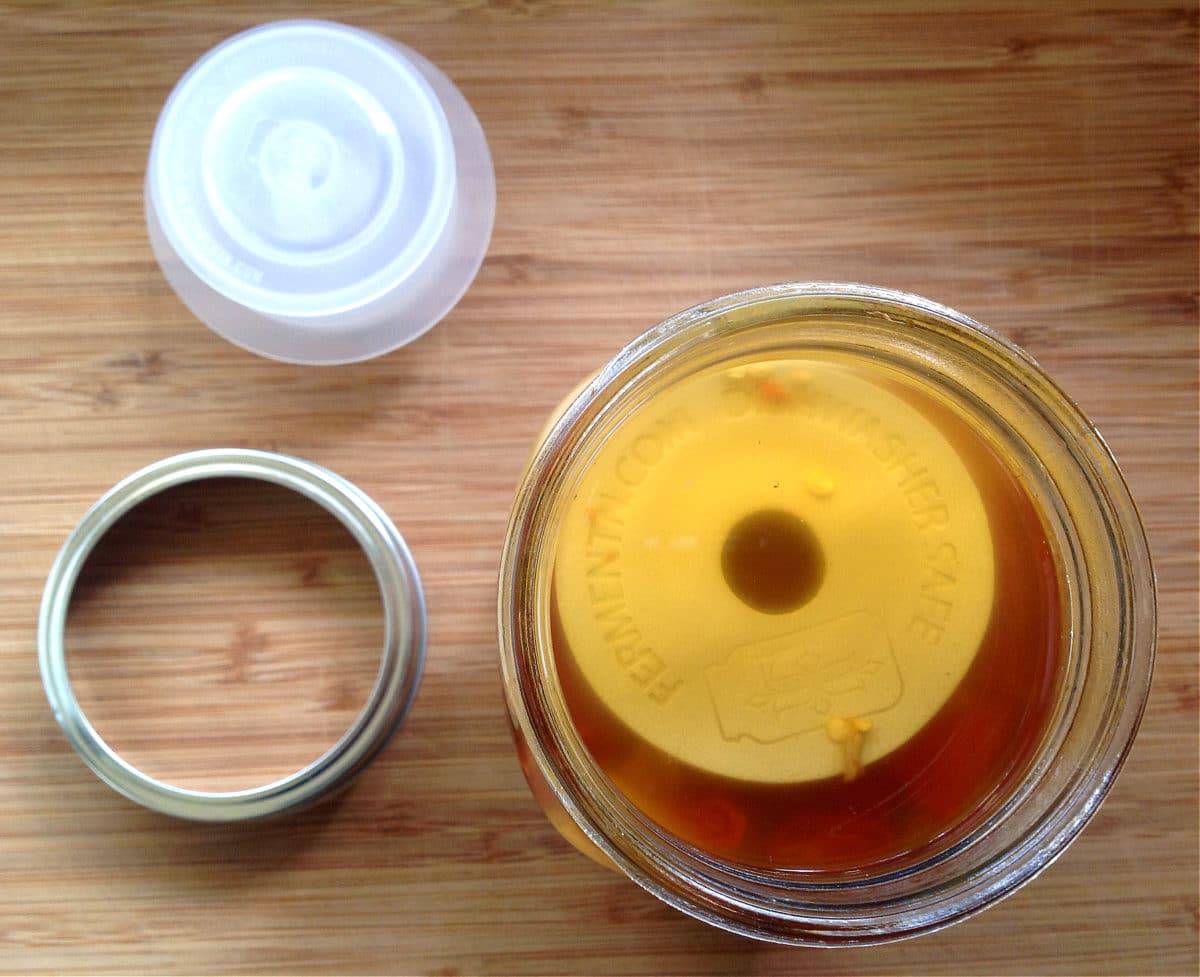 The weight will probably be totally submerged after the fermentation period, and the color of the liquid may change a little, but it’s all good!