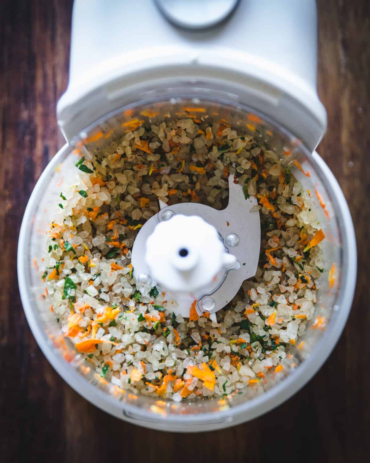 - Put the salt and herbs into a food processor (a mini one works great for this).