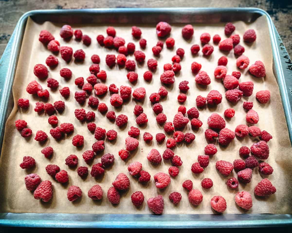 First, spread the berries onto a parchment-lined sheet pan, then put the whole sheet pan into the freezer overnight.