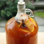 Then use a funnel to transfer this mixture, including the spices, into the gallon jug. Add the raisins and orange wedges to the jug.