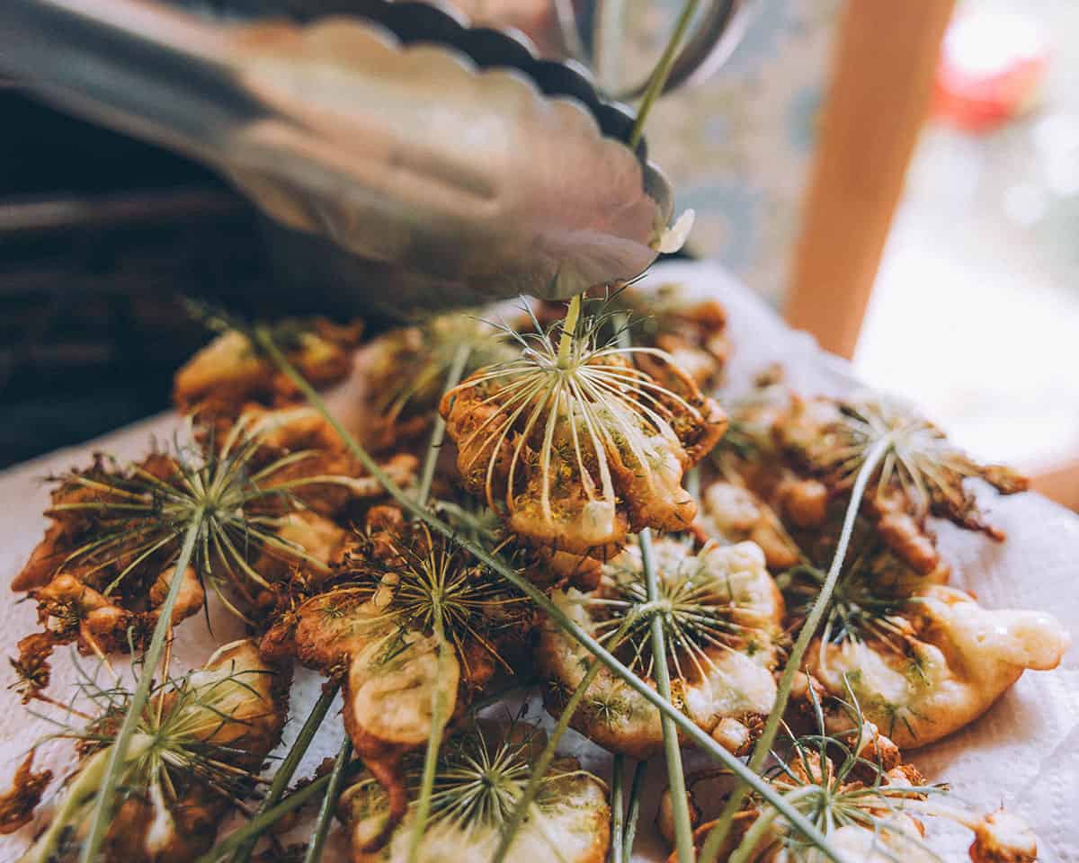 Once these tasty fritters are cool enough, they can be held by the stem to eat the flower. The green bracts are edible, but not as easy to chew as the flowers.