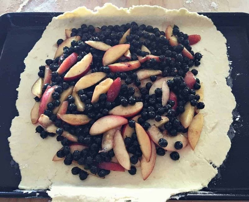 - Carefully transfer the dough onto a sheet pan, and spread the berry and fruit mixture on it, leaving an inch or two of space on the edges.