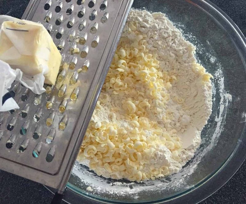- Grate the frozen butter into the dry ingredients using a cheese grater, stirring occasionally to coat the butter pieces with flour.